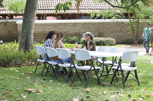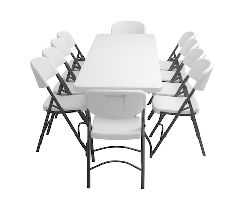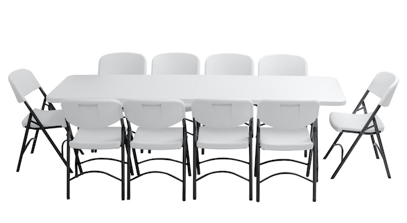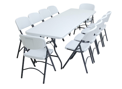 10 PersonasMesa Larga de 2.43 metros marca Oskar plegable a la mitad y de las patas, incluye 10 sillas Norman marca ZOWN resistentes (500 libras de soporte)